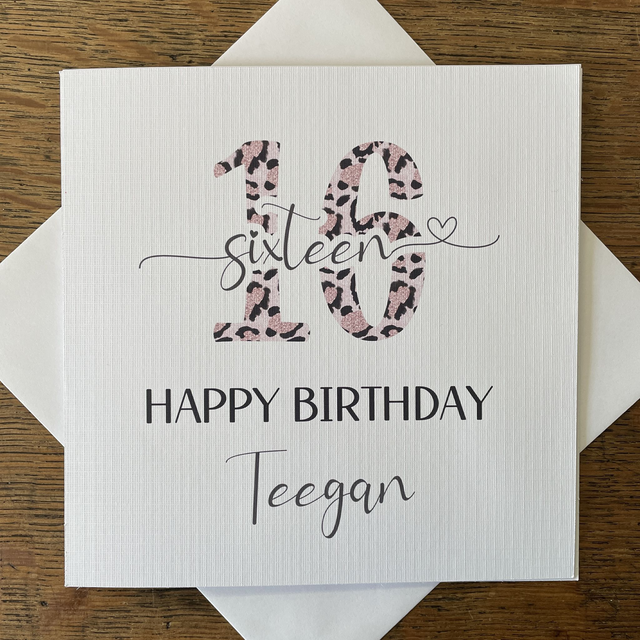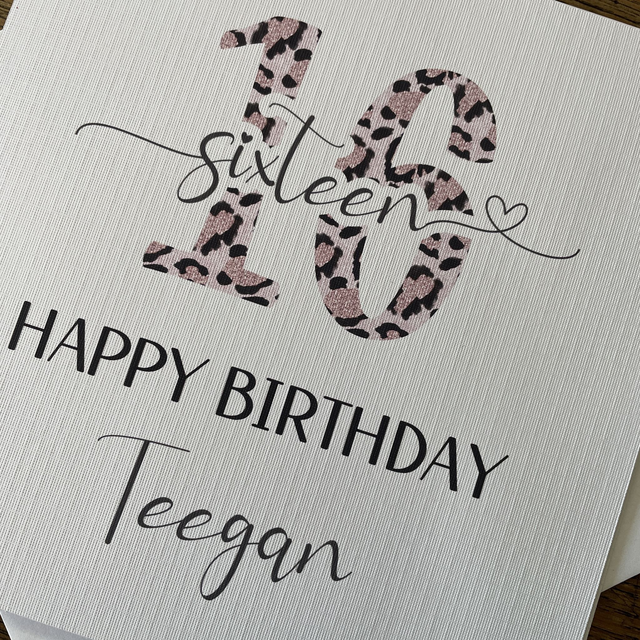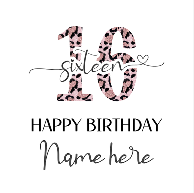 Celebrate sweet 16 with a personalised 6" square greeting card printed on high-quality white canvas paper. It comes with a white envelope, ready to mail or hand deliver. The inside of the card is left blank, so you can write your personalised message for the recipient. Add the name required at checkout to make it extra special. Order now and make someone's day!