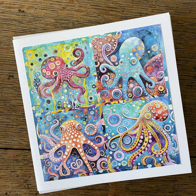 Brighten someone's day with our ocean-themed greeting cards featuring playful octopuses! Printed on premium photo or canvas paper, these cards capture the vibrant colors and textures of the sea. Choose between a 6" Kraft card with a Kraft envelope or a 5" white card with a white envelope, both left blank inside for your own message.