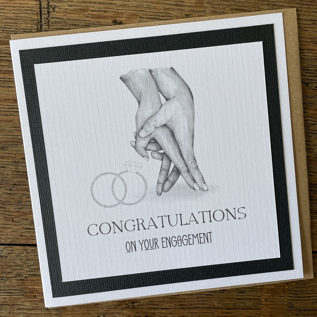 Celebrate love with our stunning engagement greeting card. The monochrome print on premium textured canvas card is layered on black and mounted onto a 13.5cm square white card. The card comes with a Kraft envelope and is left blank inside for your own message. This elegant card is perfect for congratulating a newly engaged couple. The sophisticated design makes it suitable for both formal and informal occasions. Order now and spread joy with our beautiful engagement greeting card.